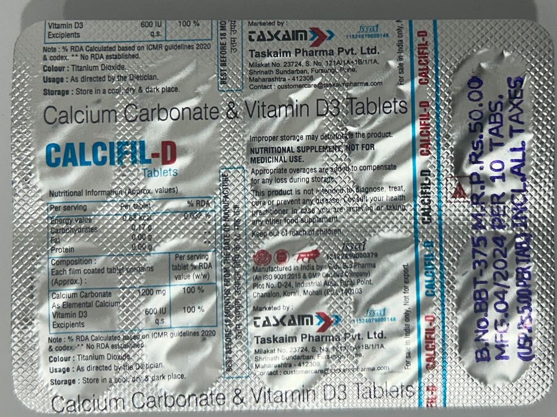 Ingredients: Calcium Carbonate 1250mg (Elemental Calcium 500mg) + Vitamin- D3 600IU
